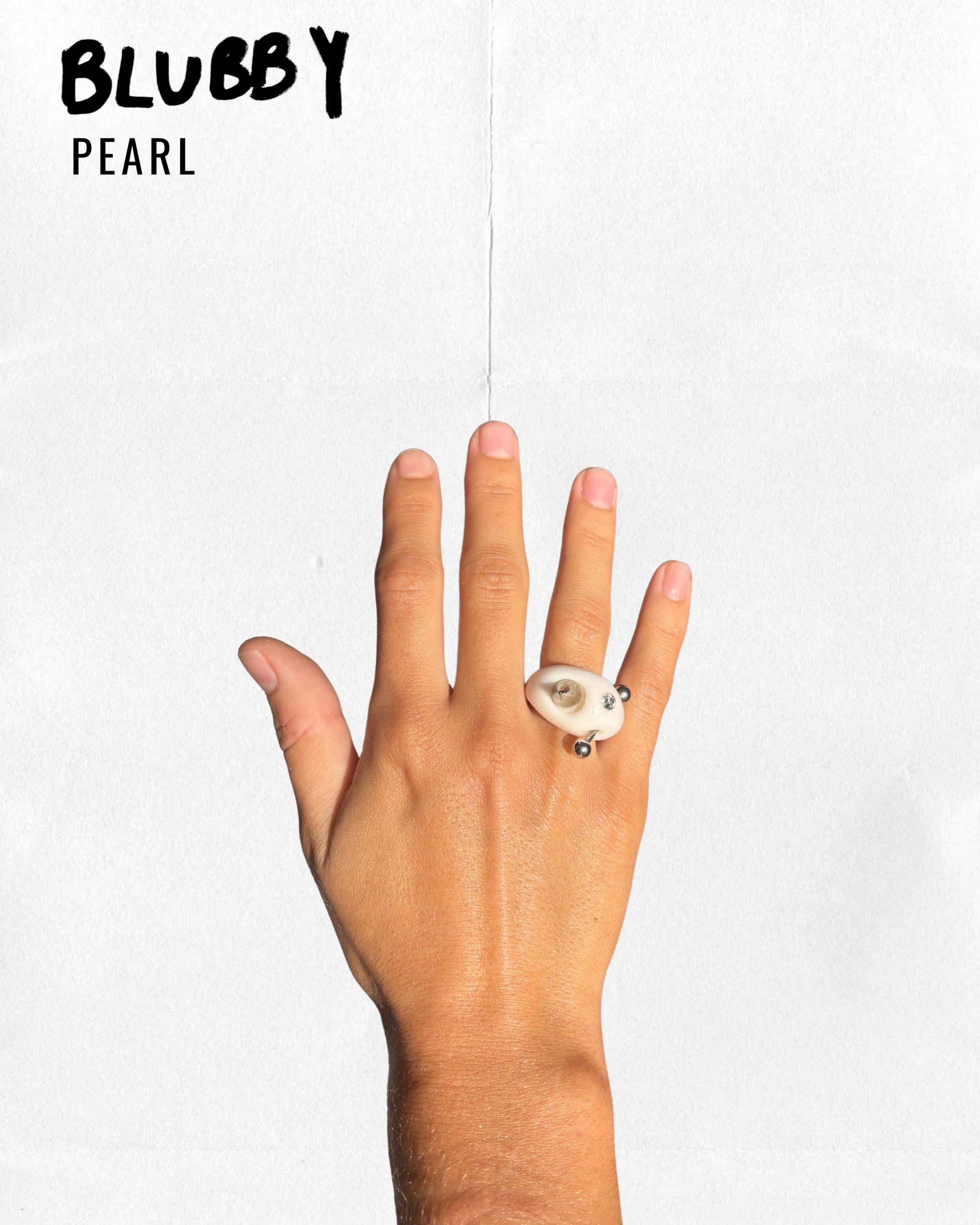 Pièce unique façonnée à la main à Paris ✶ clay, résine et trésors upcyclés. Le piercing est sélectionné pour matcher parfaitement avec la forme unique de la bague.