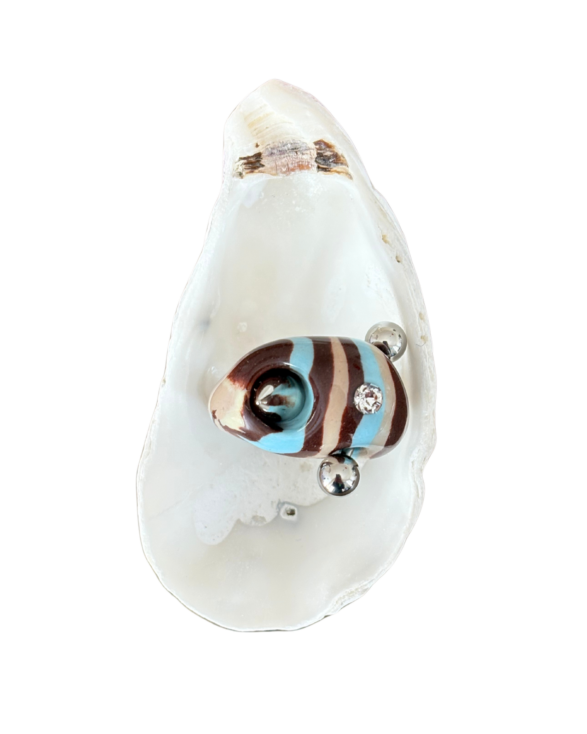 Hand-sculpted in clay, resin & upcycled materials (crystals + piercing)